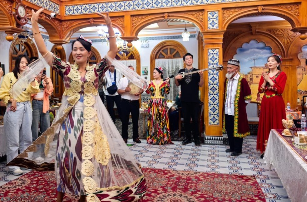 一开始,沙拉麦提·卡日自己做饭、自己跳舞,后来一个人忙不过来,就请亲戚过来一起做饭、跳舞。慢慢地,游客多了,她就请了十几个人来帮忙。